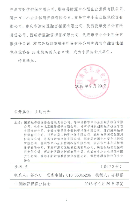 我集團(tuán)全資子公司長春東北亞融資擔(dān)保有限公司自7月26日注冊成立以來,相繼完成了業(yè)務(wù)流程設(shè)計(jì)、制度體系搭建、人員招聘、軟硬件設(shè)施建設(shè)等一系列業(yè)務(wù)開展前期準(zhǔn)備工作。為了及時(shí)把握政策動態(tài),提高公司規(guī)范化管理水平,加強(qiáng)與業(yè)內(nèi)其他機(jī)構(gòu)的交流與協(xié)作,擔(dān)保公司向中國融資擔(dān)保業(yè)協(xié)會遞交了成為會員單位的申請。9月29日,擔(dān)保公司收到了《中國融資擔(dān)保業(yè)協(xié)會關(guān)于批準(zhǔn)東北中小企業(yè)信用再擔(dān)保股份有限公司等23家機(jī)構(gòu)成為副會長、理事、會員單位的通知》,正式成為中國融資擔(dān)保業(yè)協(xié)會會員單位。